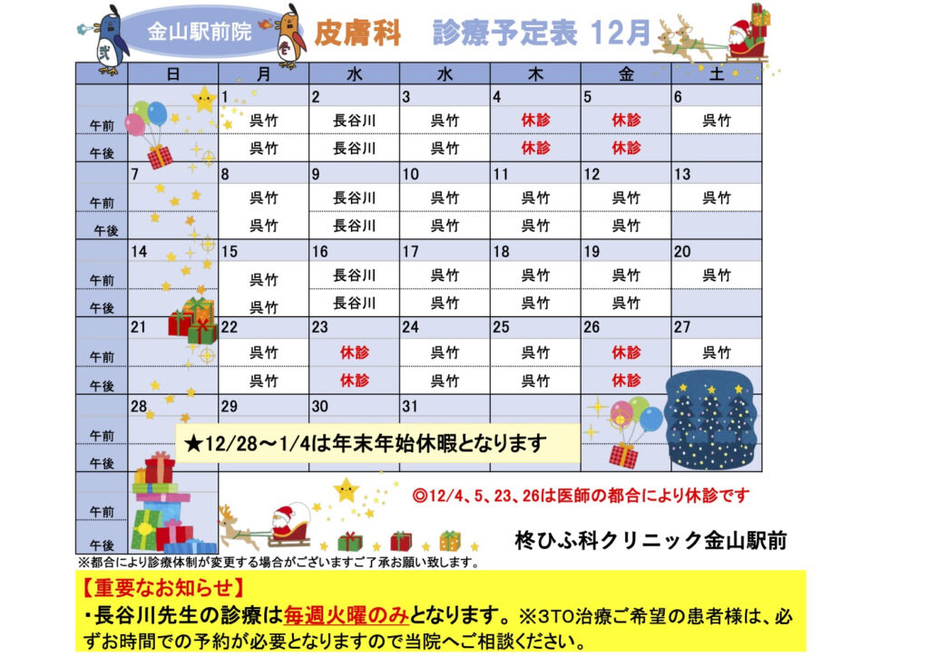 11月診療予定表 ※長谷川医師の診察は火曜日のみに変更となりました
