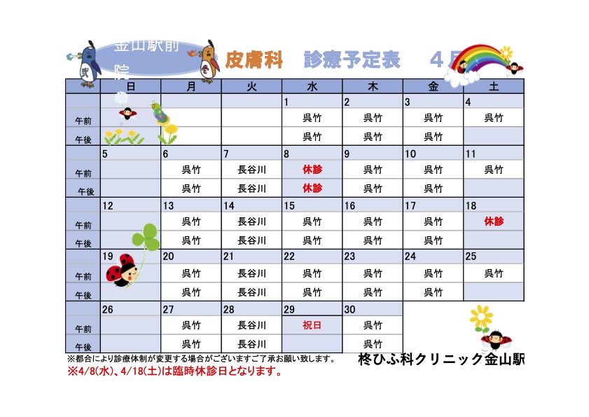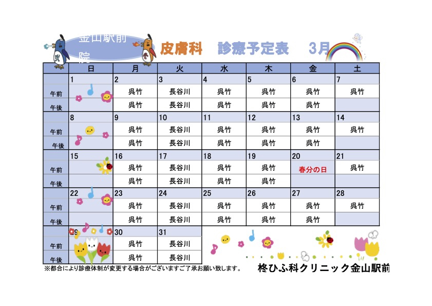 2月診療予定表 ※長谷川医師の診察は火曜日のみに変更となりました